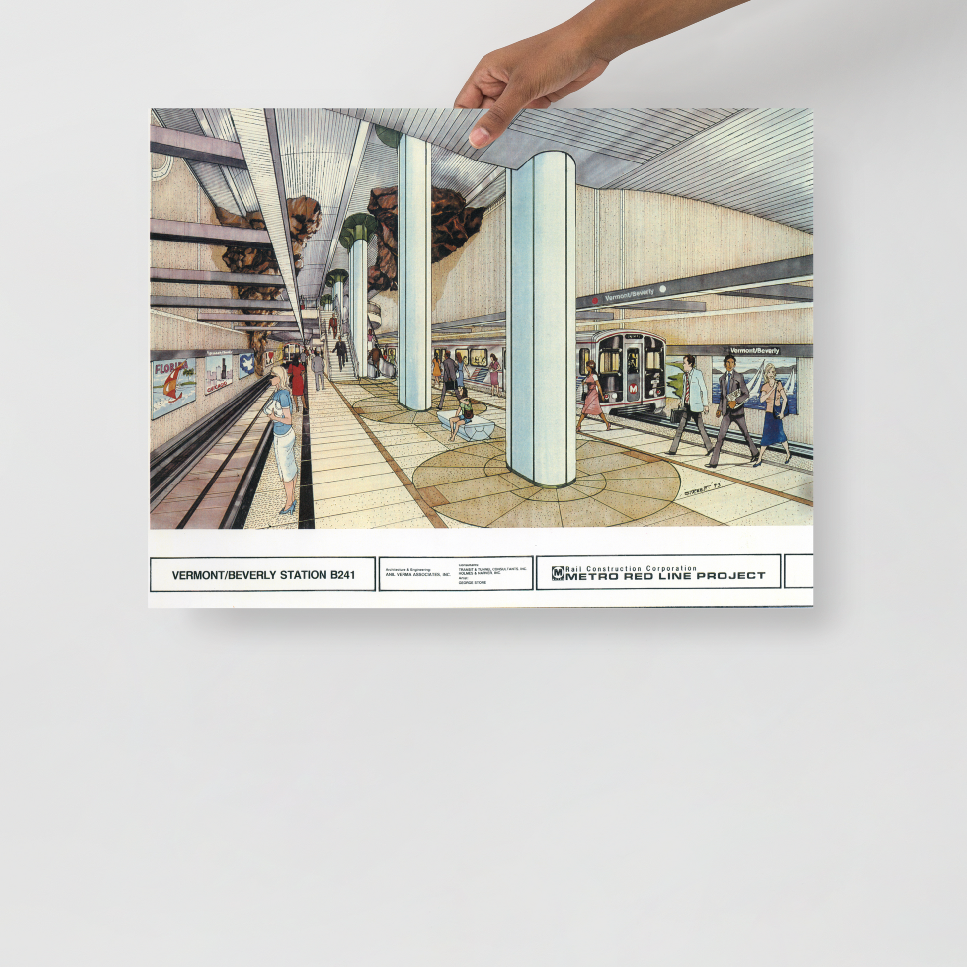 Commemorate the historical journey of LA's first underground heavy-rail line with this reprinted artist's rendering depicting the boarding platforms at the Vermont/Beverly station in 1993.This poster has a partly glossy, partly matte finish and it'll add a touch of sophistication to any room.